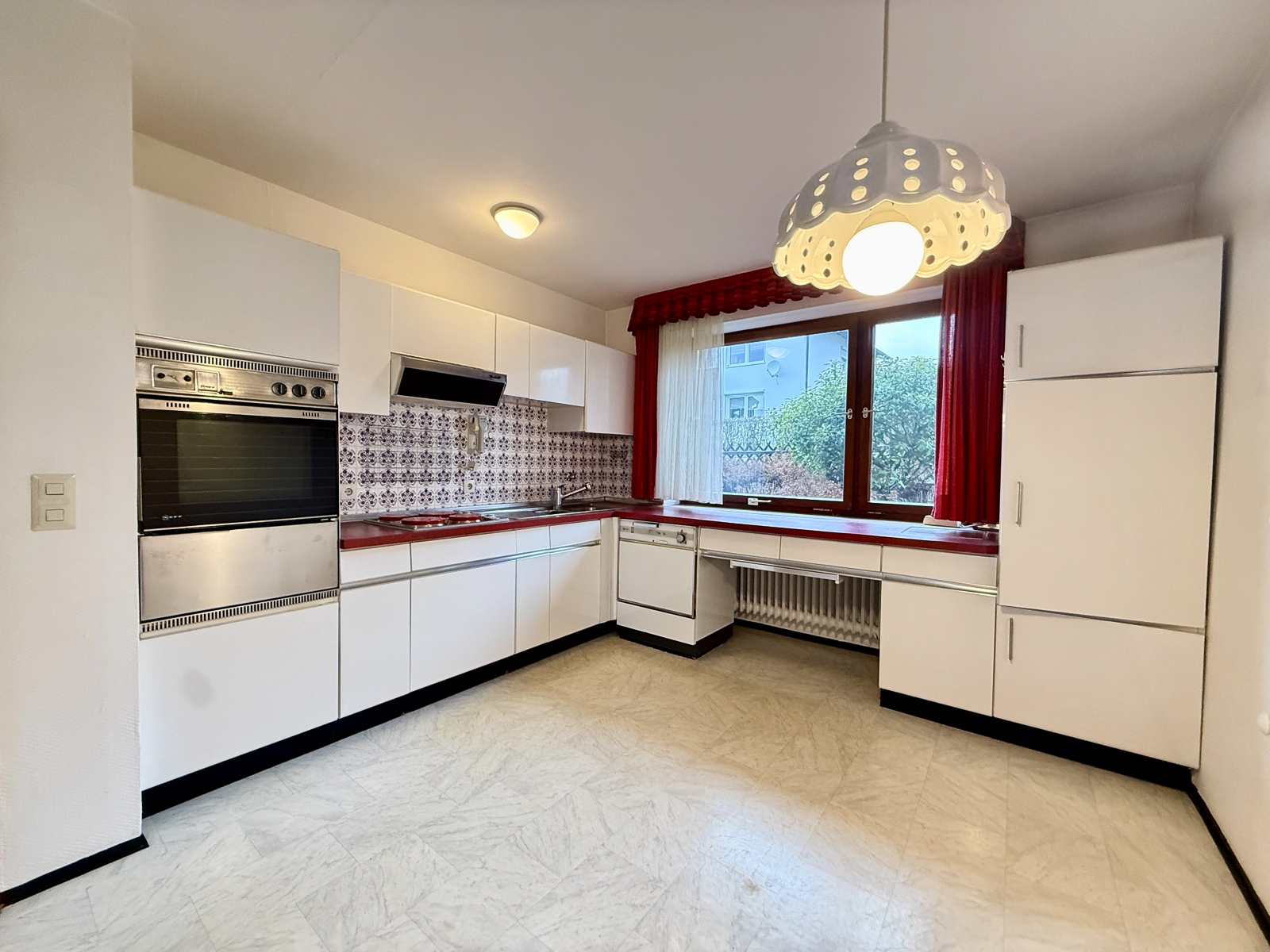 Der vollständig unterkellerte Bereich bietet reichlich Stauraum und zusätzliche Nutzungsmöglichkeiten. Unterschiedliche Bodenbeläge wie Fliesen, Parkett, Teppichboden, Laminat und PVC schaffen ein harmonisches, wohnliches Gesamtbild. Die vorhandene Einbauküche ist funktional und direkt nutzbar.